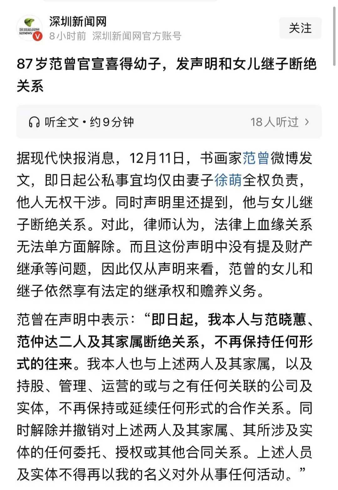 如今,想来范曾俨然沉浸在“老年得子”的愉悦里,而且官宣与女儿继子断绝关系,这也意味着刚出生的小王子地位更为显赫,乃是范家之“独苗”。